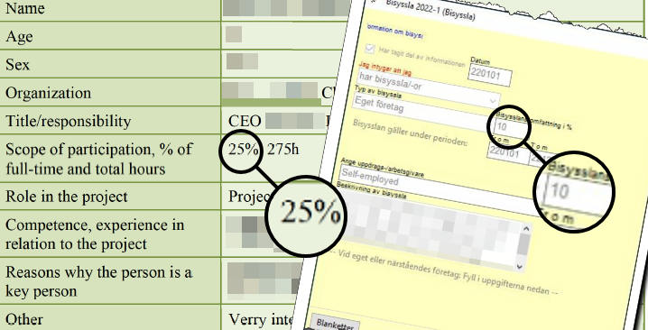 Jag kontrollerar med Chalmers om de anställda uppgivit någon bisyssla under 2022 men ingen har någon bisyssla rapporterad i forskarens bolag. I ansökan till Vinnova har forskaren intygat att hen ska arbeta 25% i 6 månader men till sitt eget universitet intygat 10%.