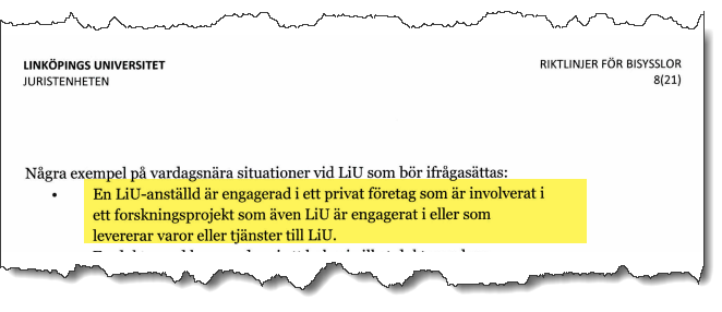 Linköpings universitet: En professor och forskare köper ett lagerbolag för att få loss bidragsmiljoner från Vinnova och ska anställa en Uppsalastudent men istället anställs en make till en arbetskollega i bolaget. En konsult ska bli VD och arbeta gratis men bolaget har ingen registrerad VD. Professorn och forskaren har intygat att bisysslan tar mindre än 40 timmar per år. LIU menar att man utgår från att de uppgifter som lämnats stämmer och skyller på Vinnova.