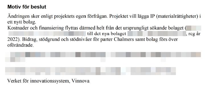 I beslutet från Vinnova skriver myndigheten: "Bidrag, stödgrund och stödnivåer för parter Chalmers samt bolag förs över oförändrade". Någon kontroll om något var förändrat gjordes inte, och Vinnova har inte svarat på mina frågor trots påminnelser.