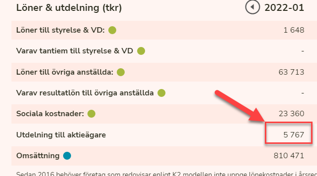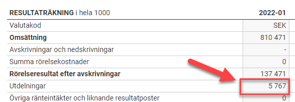 Den så kallade ordinarie utdelningen eller vanliga utdelningen är vad du hittar om du exempelvis söker på bolaget som står bakom en butik på upplysningstjänsterna. Där kommer du exempelvis se att bolaget som exempel nedan delade ut 5,8 miljoner kronor i senaste årsredovisningen för bokslutsåret som slutade i januari 2022.
