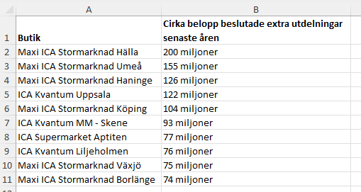 Under mitt arbete med att digitalisera ca. 13 000 bokslut under en 10 års period för alla ICA handlare och deras cirka 1232 aktiebolag så har informationen om utdelningarna samlats in.