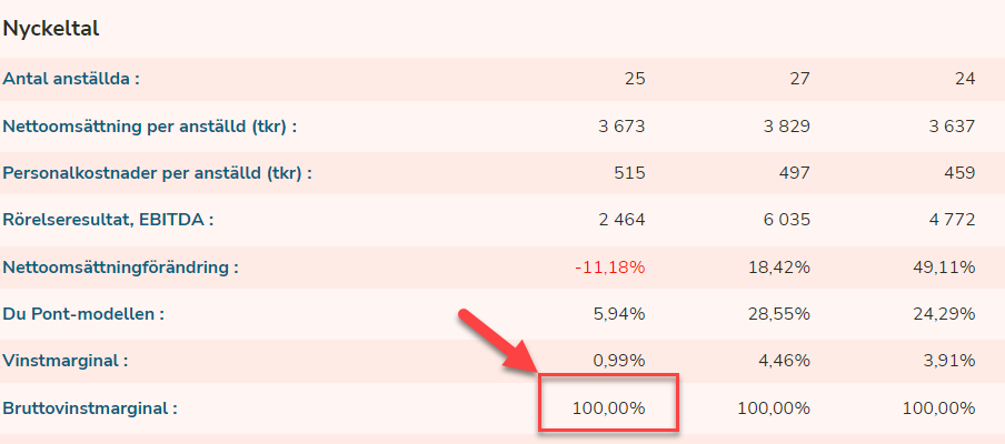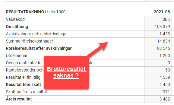 Går du till andra tjänster exempelvis Proff så saknas bruttoresultatet vilket gör att du inte kan räkna ut eller få information om bolagets bruttomarginal.