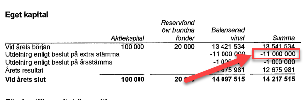Tittar man på butikens årsredovisning visar sig något helt annat. Aktieutdelningen för 2022 är korrekt 5 767 TSEK, cirka 5,8 miljoner kronor, men om man tittar i förändringarna i balanserad vinst så har handlaren gjort två stycken extra utdelningar efter förra bokslutet på ca. 40 miljoner.