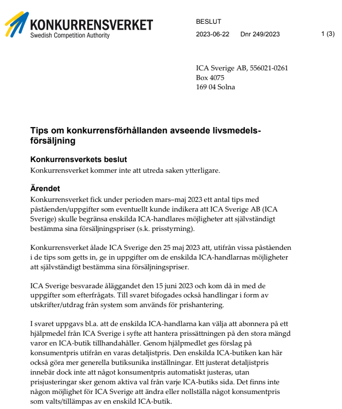 Konkurrensverket har i beslut daterat 22 juni 2023 (Dnr 249/2023) beslutat att inte prioritera fortsatt utredning av ICA:s prisstyrning.