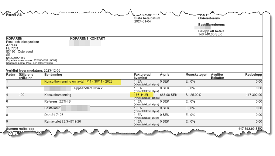 Jag tittar på fakturan 221 100 kr och jämför med avtalet 670 kr / h dvs 330 timmar som alltså är heltid. Jag frågar PTS om fakturan: