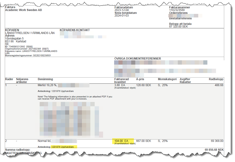 För oktober, november och december fakturerar upphandlaren Länsstyrelsen 104 timmar/månad genom Academic Work. Samtidigt fakturerar ett annat bemanningsföretag,Perido, PTS för samma upphandlare 168 timmar för oktober, 176 timmar för november och genomsnittligt 160 timmar för december (fakturan avser 2 månader).