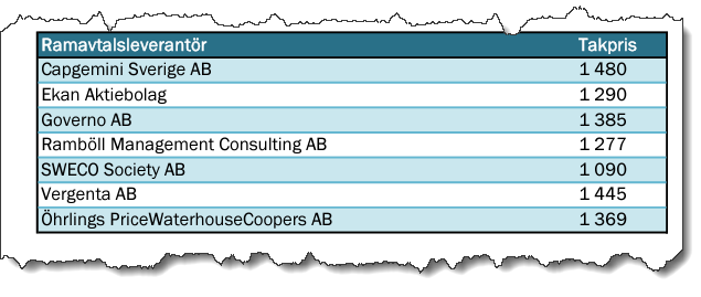 I avropsförfrågan är utvärderingsmodellen att 80% viktas med intervju + mervärde och 20% priset. Ramavtalet har sju leverantörer och en lista på takpriser för senior konsulter som varierar mellan 1090 - 1480 kr per timme.