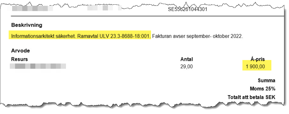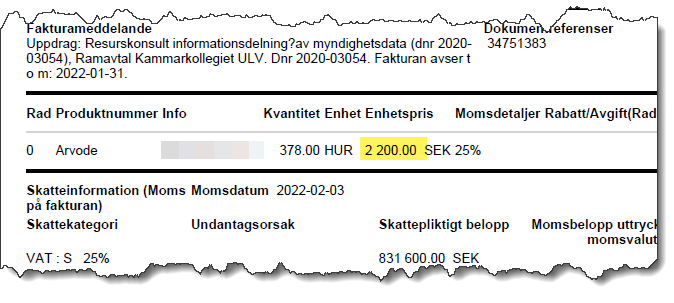 På fakturan till Vinnova framgår att även i denna upphandling har takpriset frångåtts och Vinnova betalar 1900 kr per timme.
