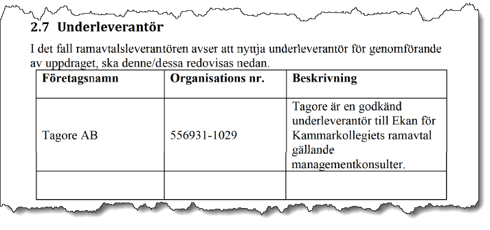 Konsultbolaget Ekan som vann upphandlingen skriver i sitt svar att en underleverantör, Tagore AB, ska genomföra uppdraget.