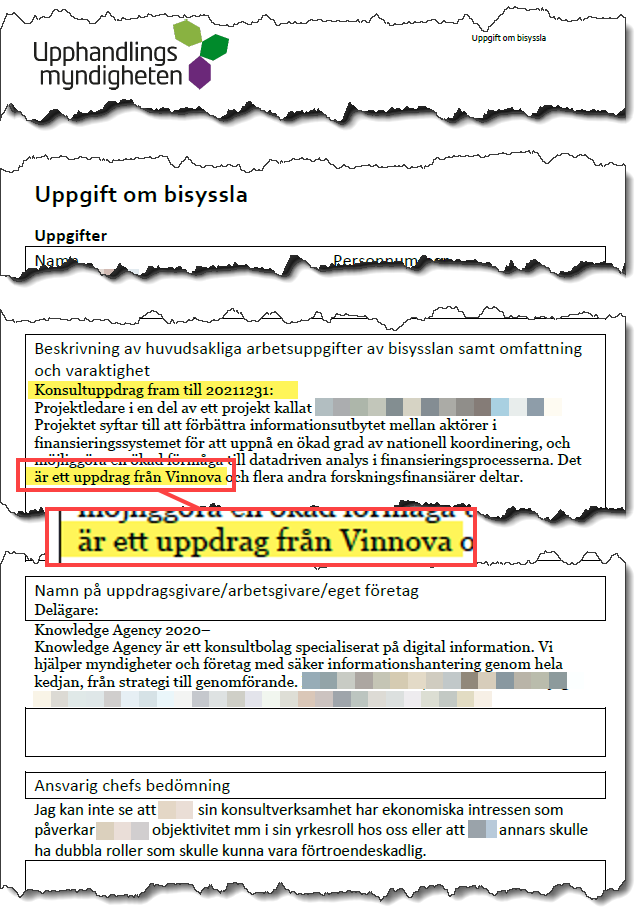 I september 2021, alltså redan innan delägaren började arbeta för Upphandlingsmyndigheten, så lämnas en uppgift om bisyssla in till myndigheten. Delägaren beskriver att hen ska ha ett konsultuppdrag åt Vinnova fram till 2021-12-31 men omfattningen redovisas inte. Upphandlingsmyndigheten beviljar bisysslan.