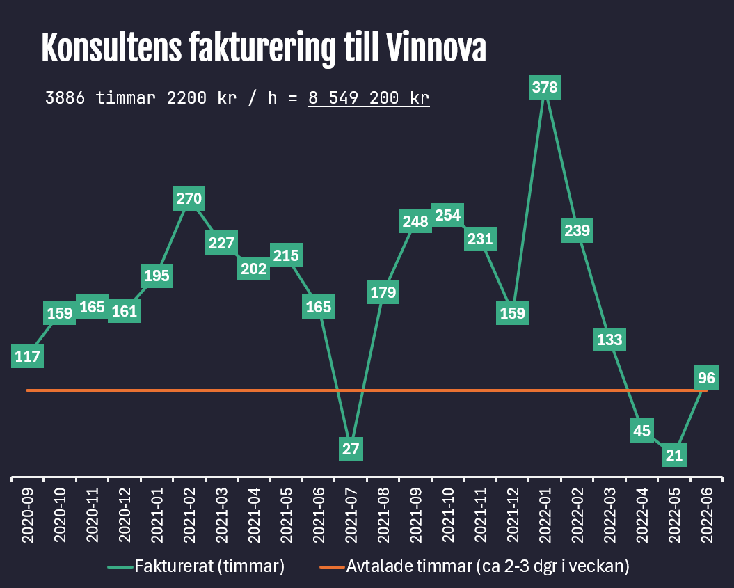 Jag har gått igenom fakturorna och konstaterar att det skriftliga avtalet inte har följts. Konsulten har genomgående fakturerat betydligt mer än motsvarande heltidsuppdrag och långt mer än de 2-3 dagar per vecka (50%) som avtalats. Därtill har faktureringen fortsatt trots att avtalet upphörde 2021-12-31 efter en förlängning. Jag har begärt ut tidsredovisningen från Vinnova, som trots påminnelser inte svarar på min begäran.