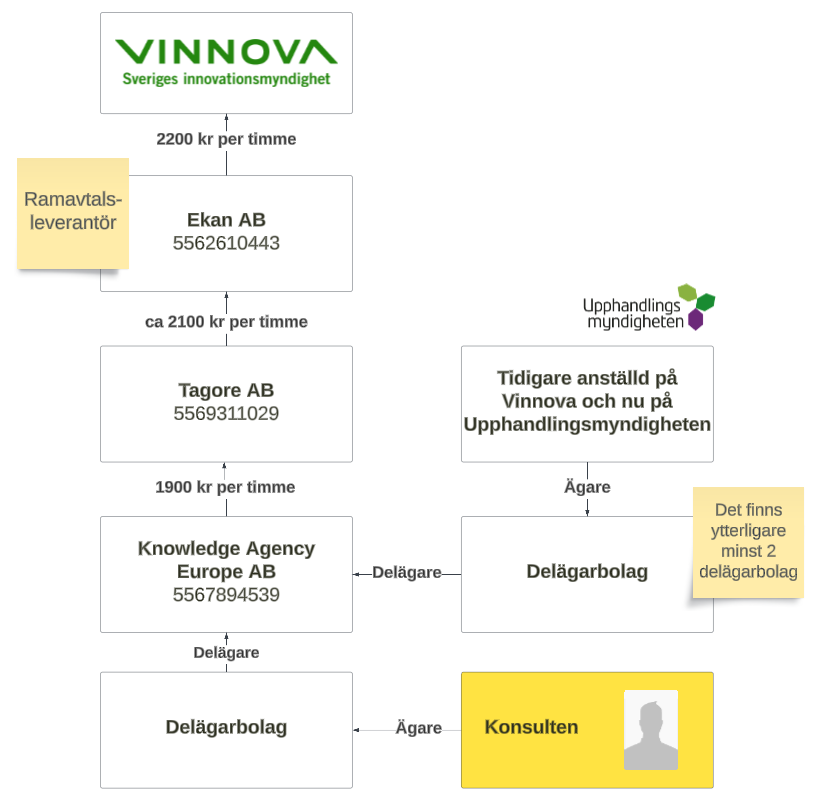 Bakom Knowledge Agency Europe AB står minst fyra delägare: konsulten, en tidigare anställd på Vinnova som nu arbetar på Upphandlingsmyndigheten samt ytterligare minst två personer.