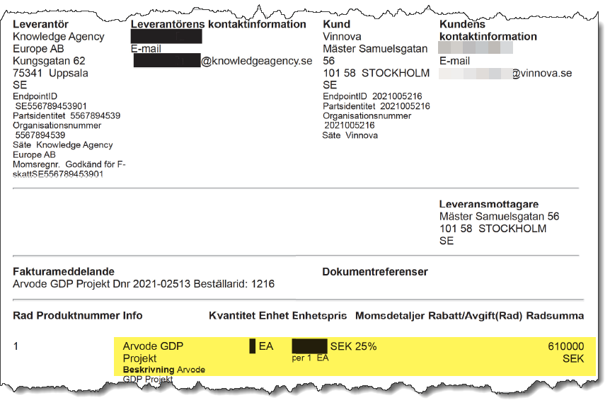 Jag har i flera omgångar sökt delägaren hos Upphandlingsmyndigheten, som till slut kommenterar via e-post att något arbete inte utförts åt Vinnova - men inte vill svara på vem som i så fall övertog uppgifterna. Vinnova har valt att maskera uppgifter på fakturan för projektet där hen skulle utföra arbetet som kostade 610 000 kr.