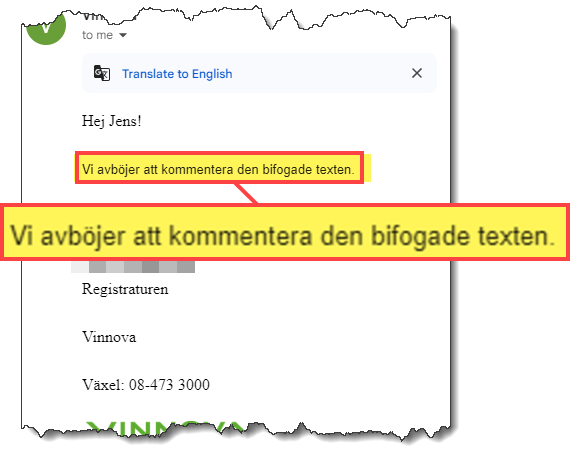Jag har försökt nå Vinnovas generaldirektör, Darja Isaksson, för en kommentar och pressekreteraren Daniel Holmberg svarar att jag ska e-posta frågorna till Vinnovas registrator. Jag skickar därför hela utkastet till artikeln och får nästa dag ett svar: