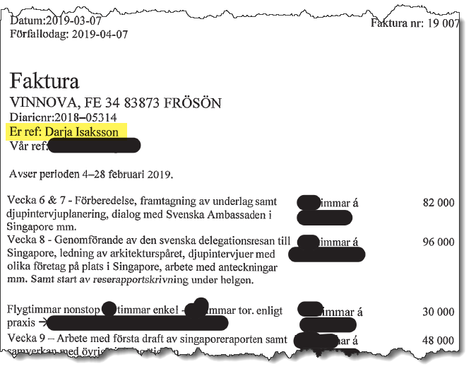 I mars 2019 åker Darja Isaksson med konsulten på en delegationsresa till Singapore, och fakturorna kommer då från konsultens egna bolag som fakturerade 1 210 118 kr exklusive moms för förberedelser, delegationsresan och diverse möten med DIGG och Inera under perioden februari - juni 2019.