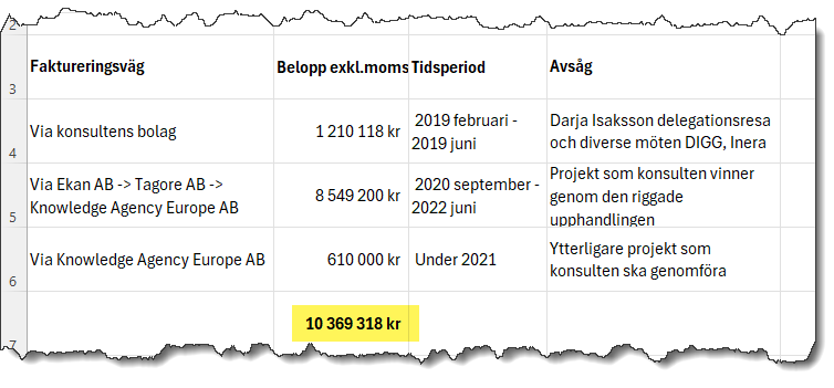 Totalt betalar Vinnova 10 369 318 kr exklusive mervärdesskatt för konsulten under perioden mellan februari 2019 och juni 2022.